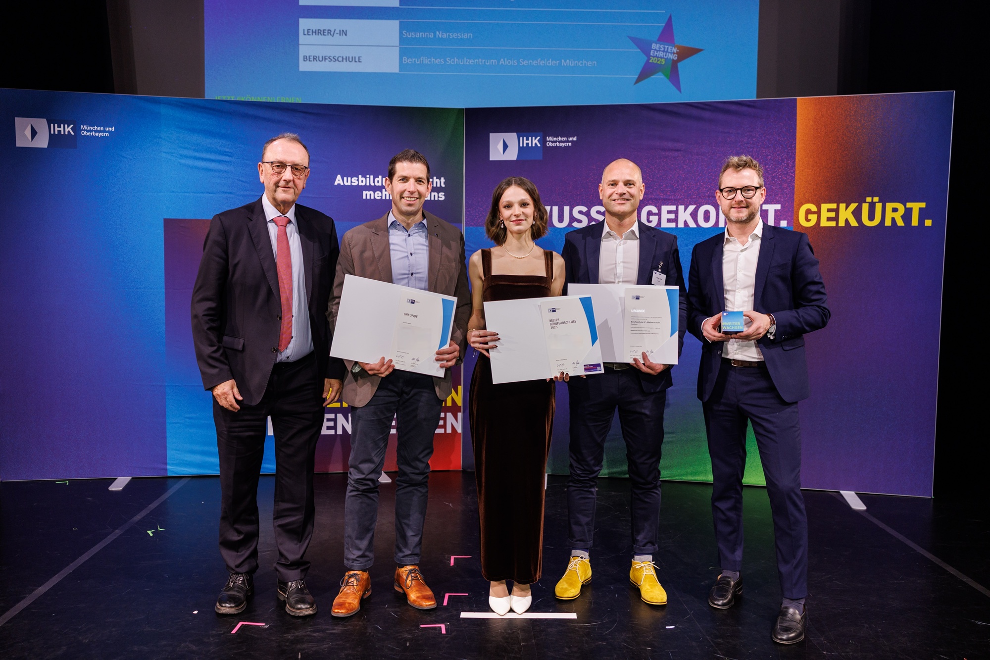 Da die Auszubildenden unserer Schule je nach Ausbildungsbetrieb unterschiedlichen Kammerbezirken zugeordnet sind, fanden die Feierlichkeiten in diesem Jahr zeitgleich an zwei beeindruckenden Orten statt: Die IHK Schwaben lud zur Ehrung in die WWK Arena in Augsburg ein, während die IHK für München und Oberbayern ihre Besten im glanzvollen Ambiente des GOP Varieté-Theaters in München feierte.